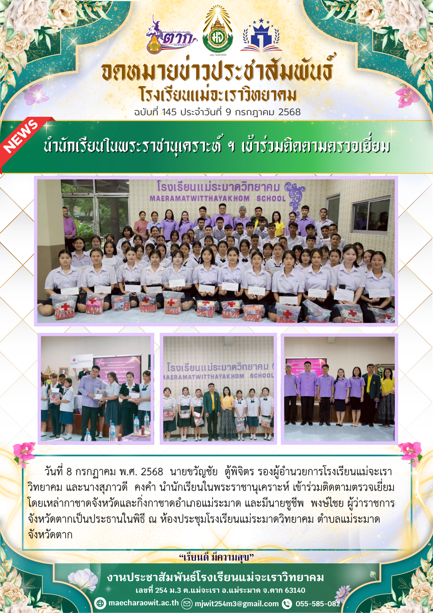 วันที่ 8 กรกฏาคม พ.ศ. 2568 นายขวัญชัย ตู้พิจิตร รองผู้อำนวยการโรงเรียนแม่จะเราวิทยาคม และนางสุภาวดี คงคำ นำนักเรียนในพระราชานุเคราะห์ เข้าร่วมติดตามตรวจเยี่ยม โดยเหล่ากาชาดจังหวัดและกิ่งกาชาดอำเภอแม่ระมาด และมีนายชูชีพ พงษ์ไชย ผู้ว่าราชการจังหวัดตากเป็นประธานในพิธี ณ ห้องประชุมโรงเรียนแม่ระมาดวิทยาคม ตำบลแม่ระมาด จังหวัดตาก