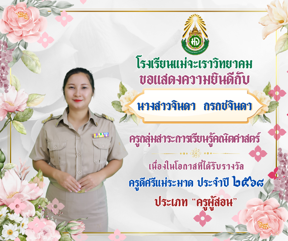 โรงเรียนแม่จะเราวิทยาคมขอแสดงความยินดีกับนางสาวจินดา กรกชจินดา เนื่องจากได้รับรางวัลครูดีศรีแม่ระมาด