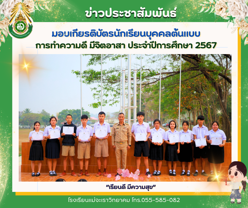 มอบเกียรติบัตรนักเรียนบุคคลต้นแบบการทำความดี มีจิตอาสา ประจำปีการศึกษา 2567