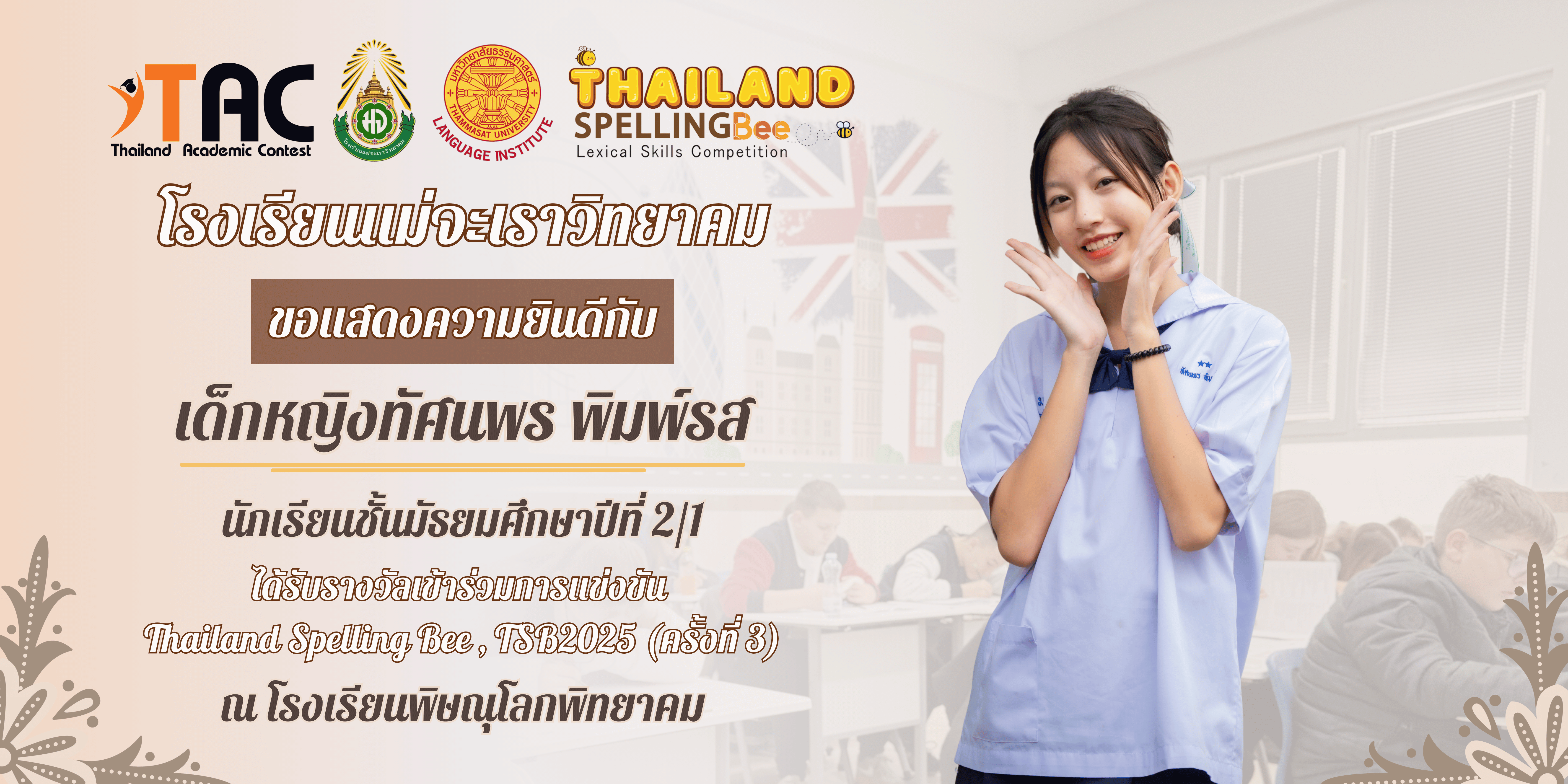เด็กหญิงทัศนพร พิมพ์รส นักเรียนชั้นมัธยมศึกษาปีที่ 2/1 ได้รับรางวัล "เข้าร่วมการแข่งขัน" Thailand Spelling Bee , TSB2025 (ครั้งที่ 3) ณ โรงเรียนพิษณุโลกพิทยาคม
