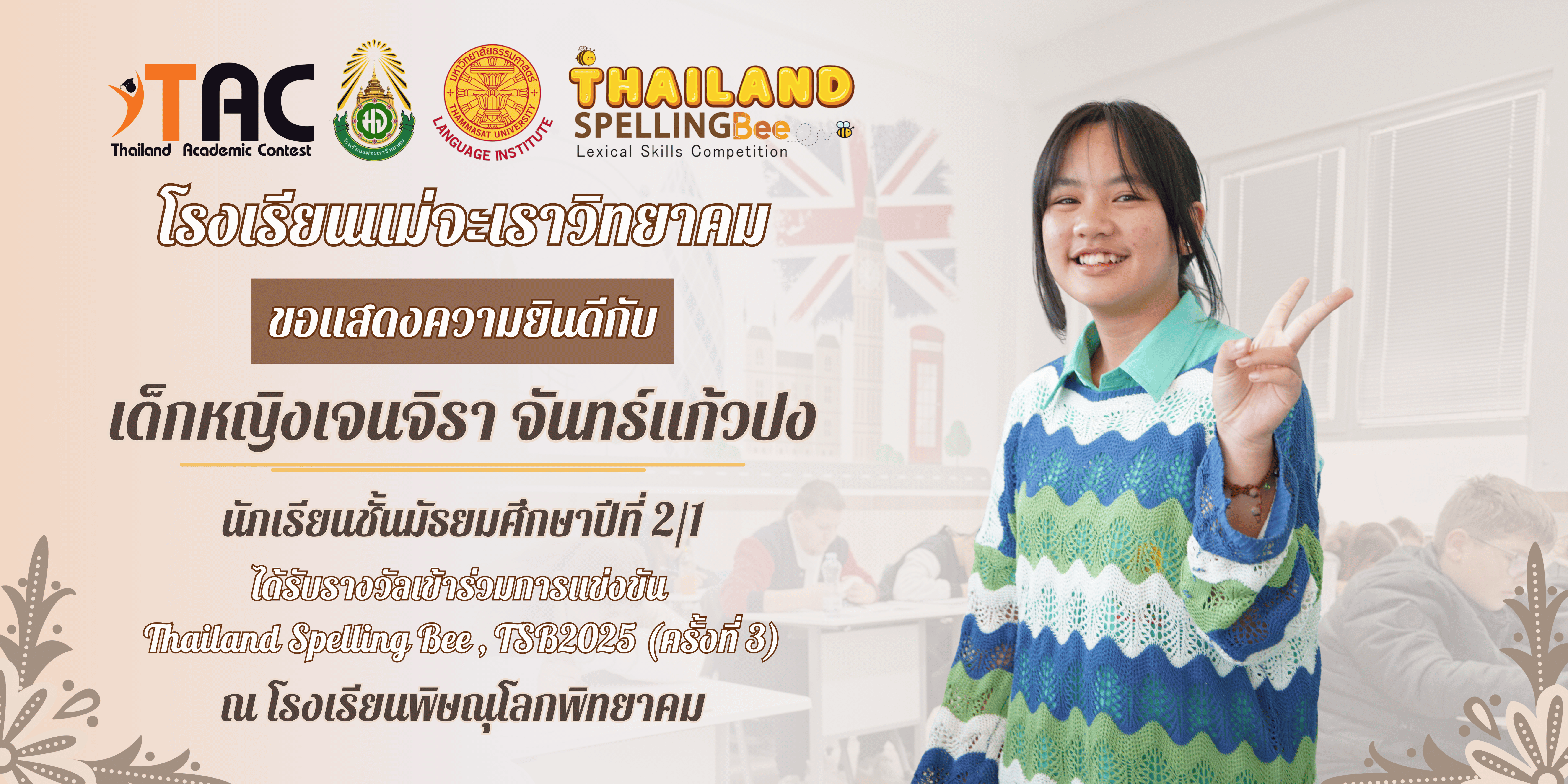 เด็กหญิงเจนจิรา จันทร์แก้วปง นักเรียนชั้นมัธยมศึกษาปีที่ 2/1 ได้รับรางวัล "เข้าร่วมการแข่งขัน" Thailand Spelling Bee , TSB2025 (ครั้งที่ 3) ณ โรงเรียนพิษณุโลกพิทยาคม