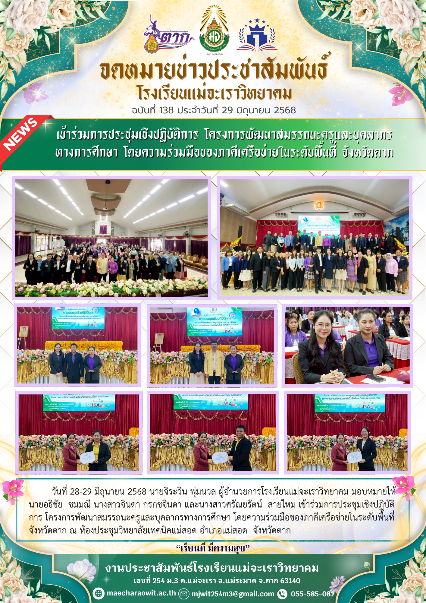 วันที่ 28-29 มิถุนายน 2568 นายจิระวิน พุ่มนวล ผู้อำนวยการโรงเรียนแม่จะเราวิทยาคม มอบหมายให้ นายอธิชัย ชมมณี นางสาวจินดา กรกชจินดา และนางสาวศรัณยรัตน์ สายใหม เข้าร่วมการประชุมเชิงปฎิบัติการ โครงการพัฒนาสมรรถนะครูและบุคลากรทางการศึกษา โดยความร่วมมือของภาคีเครือข่ายในระดับพื้นที่ จังหวัดตาก ณ ห้องประชุมวิทยาลัยเทคนิคแม่สอด อำเภอแม่สอด จังหวัดตาก