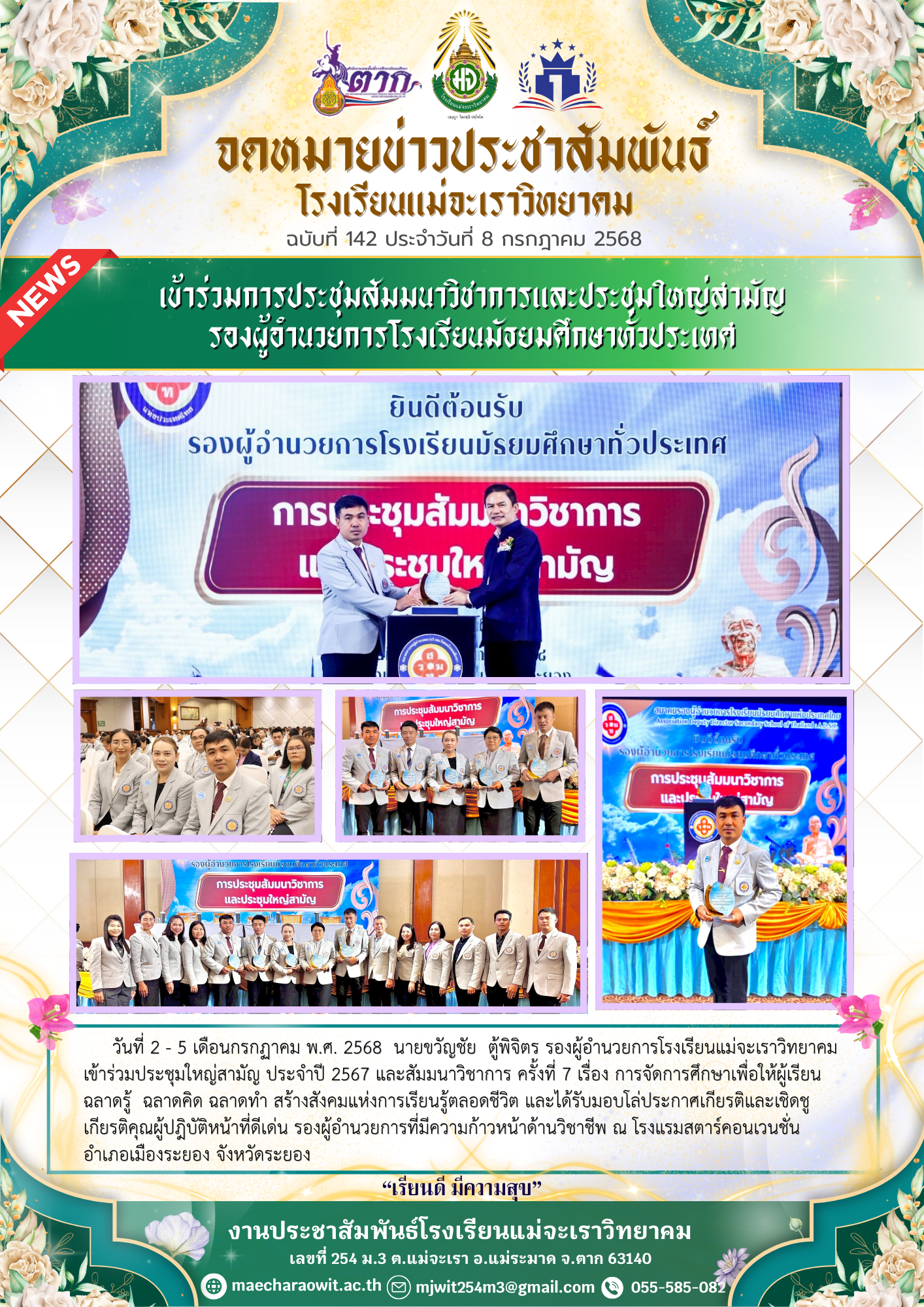 วันที่ 2 - 5 เดือนกรกฏาคม พ.ศ. 2568 นายขวัญชัย ตู้พิจิตร รองผู้อำนวยการโรงเรียนแม่จะเราวิทยาคม เข้าร่วมประชุมใหญ่สามัญ ประจำปี 2567 และสัมมนาวิชาการ ครั้งที่ 7 เรื่อง การจัดการศึกษาเพื่อให้ผู้เรียน ฉลาดรู้ ฉลาดคิด ฉลาดทำ สร้างสังคมแห่งการเรียนรู้ตลอดชีวิต และได้รับมอบโล่ประกาศเกียรติและเชิดชูเกียรติคุณผู้ปฎิบัติหน้าที่ดีเด่น รองผู้อำนวยการที่มีความก้าวหน้าด้านวิชาชีพ ณ โรงแรมสตาร์คอนเวนชั่น อำเภอเมืองระยอง จังหวัดระยอง