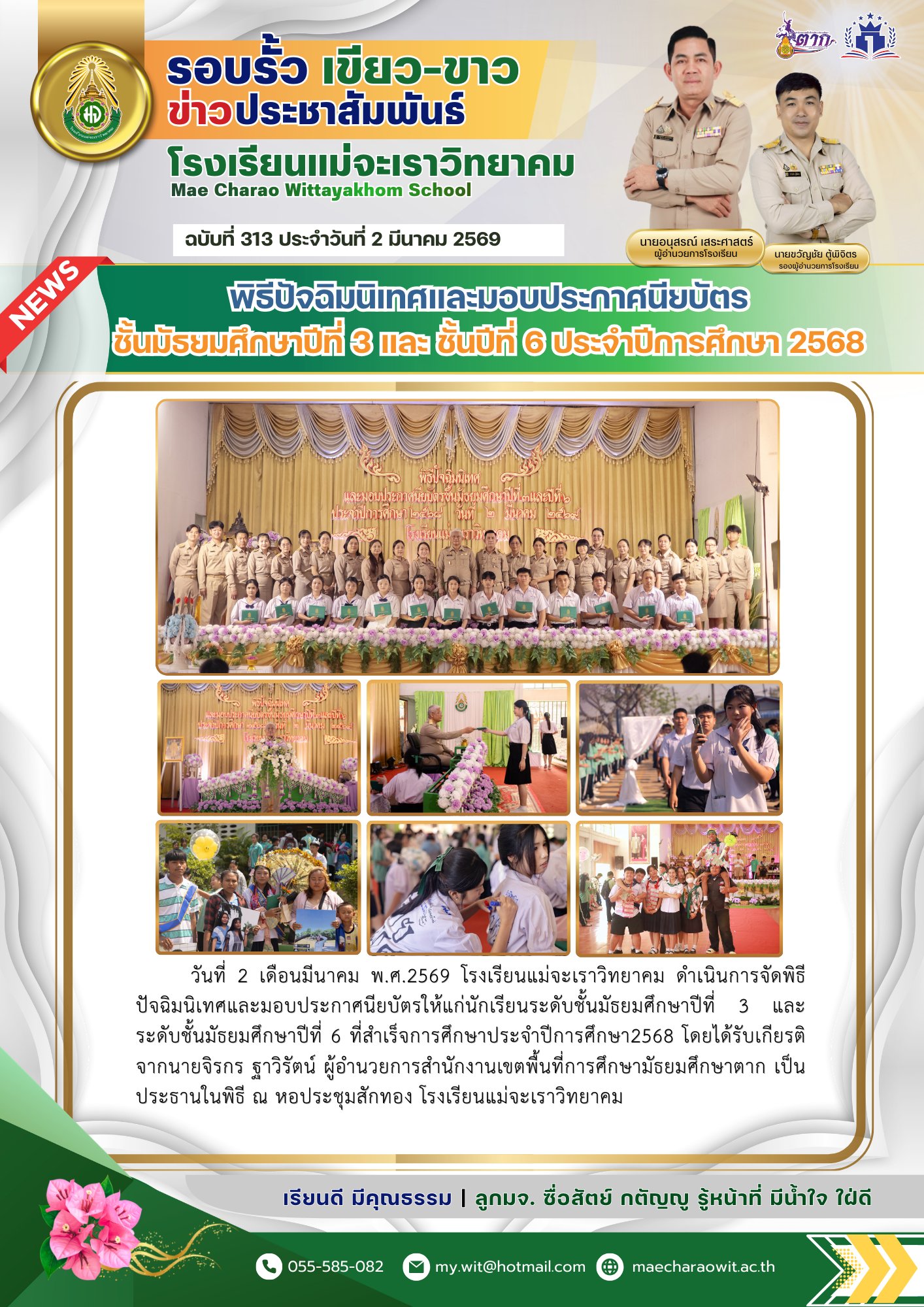 วันที่ 2 เดือนมีนาคม พ.ศ.2569 โรงเรียนแม่จะเราวิทยาคม ดำเนินการจัดพิธีปัจฉิมนิเทศและมอบประกาศนียบัตรให้แก่นักเรียนระดับชั้นมัธยมศึกษาปีที่ 3 และ ระดับชั้นมัธยมศึกษาปีที่ 6 ที่สำเร็จการศึกษาประจำปีการศึกษา 2568 โดยได้รับเกียรติจากนายจิรกร ฐาวิรัตน์ ผู้อำนวยการสำนักงานเขตพื้นที่การศึกษามัธยมศึกษาตาก เป็นประธานในพิธี ณ หอประชุมสักทอง โรงเรียนแม่จะเราวิทยาคม
