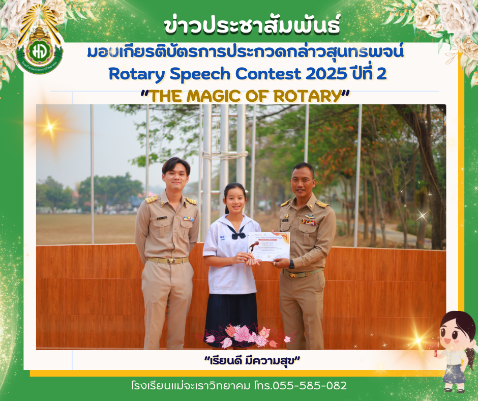 มอบเกียรติบัตรการประกวดกล่าวสุนทรพจน์ Rotary Speech Contest 2025 ปีที่ 2 "The Magic Of Rotary" ให้แก่นักเรียนและครูผู้ฝึกสอน