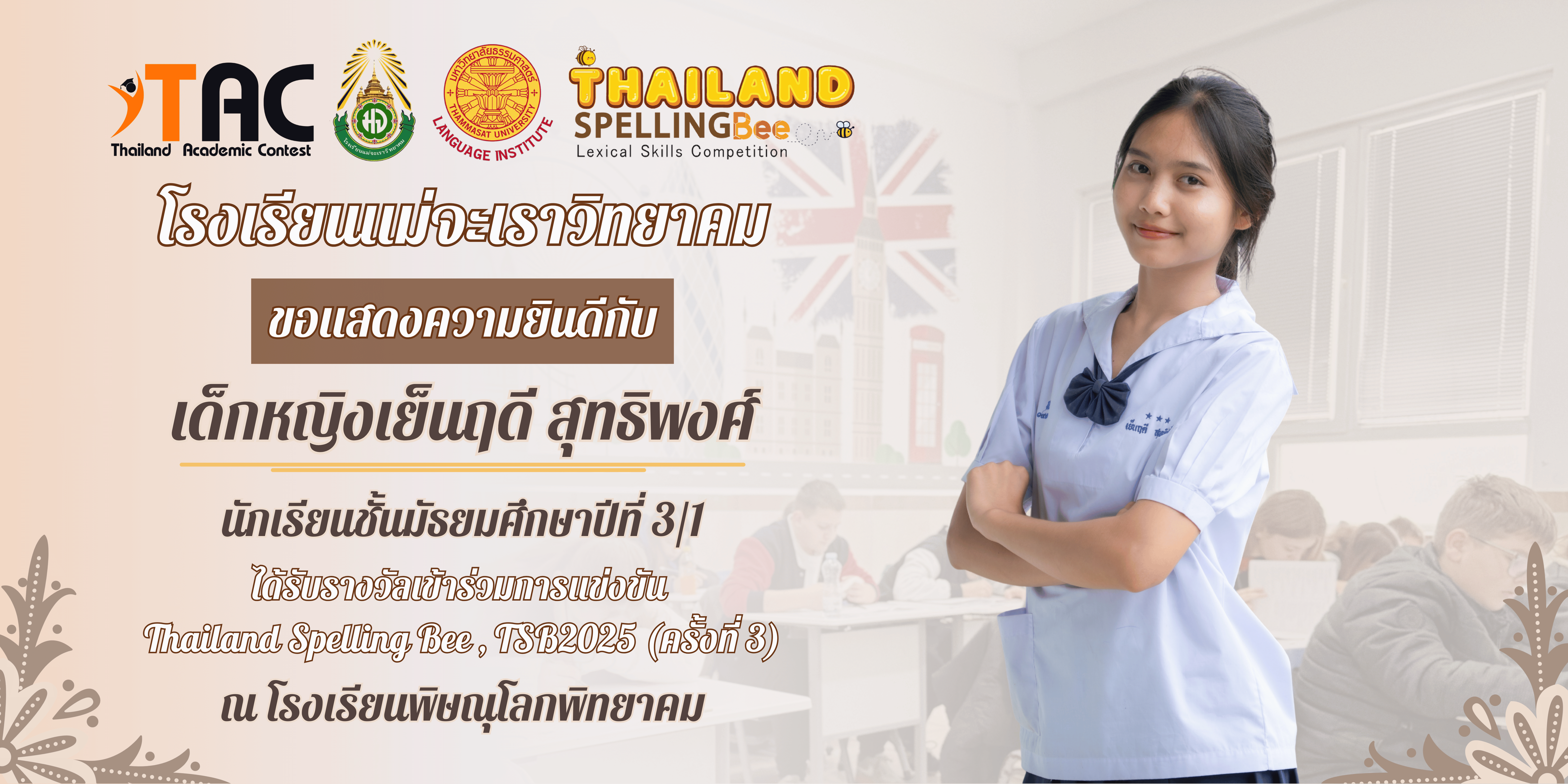 เด็กหญิงเย็นฤดี สุทธิพงศ์ นักเรียนชั้นมัธยมศึกษาปีที่ 3/1 ได้รับรางวัล "เข้าร่วมการแข่งขัน" Thailand Spelling Bee , TSB2025 (ครั้งที่ 3) ณ โรงเรียนพิษณุโลกพิทยาคม